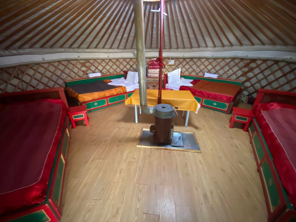 Đang ngủ ngon thì có tiếng ồn ào, mọi người đã quay trở lại, chúng tôi cứ nghĩ sẽ ở lại khu này thì thấy Batmunkh gọi ra xe, hóa ra đêm nay chúng tôi sẽ ngủ ở 1 nơi khác. Lại đi trên con đường đầy ổ gà, nhưng gần ra đến cao tốc thì lại rẽ sang hướng khác, chúng tôi thấy 1 khu resort nằm giữa thảo nguyên rộng lớn. Lúc này đã hơn 5h chiều, chúng tôi đi vào thẳng nhà hàng, ngồi chờ để nhận ger, khu này cũng vắng tanh như chỗ resort ở Kharkhorin, chỉ có duy nhất chúng tôi là khách, có 2 bạn nhân viên phục vụ mà thôi. Vì khu này vắng tanh nên chúng tôi rất nhanh được nhận ger, nhưng mở cửa ra là 1 mùi hôi bốc lên, mùi của da bò chưa thuộc. Mỗi ger đều được làm từ da bò yak, mà loại bò này da thì siêu dày, lại hôi, người Mông Cổ quen rồi chứ chúng tôi không thể quen được, phải mở cửa ra hơn 30p mới bớt mùi mà bước vào được. Phải công nhận là từng ger chúng tôi ở chỉ có rộng hơn chứ không có bé hơn, ger này có tận 4 cái giường, người thì ít mà kê lắm để làm gì không biết. Xếp đồ xong thì chúng tôi đi ra ngoài ngắm nghía chút, chỉ cần đứng ở ngay cửa ger của mình là đã có thể thấy thảo nguyên rộng lớn và núi cao trước mặt. Đang đứng hít thở không khí trong lành nơi này thì tôi nghe thấy tiếng chó sủa, vội vàng lôi điện thoại ra zoom lên, những con chó đang lùa đàn ngựa về chuồng, 1 người đàn ông phi ngựa ở đằng sau, ở cách đó không xa có 1 ger rất lớn, là nhà của người đàn ông đó, tôi có thể thấy người vợ đang đứng ở cửa chờ chồng mình. Cảnh tượng đàn ngựa chạy về chuồng diễn ra khoảng 15p thì cũng xong, những con ngựa nhanh chóng được quây lại, người chủ nhanh chóng đóng cửa chuồng, buộc lại con ngựa mình cưỡi vào cột rồi rảo bước về nhà, người vợ giang rộng tay ôm hôn chồng rồi cùng vào nhà.