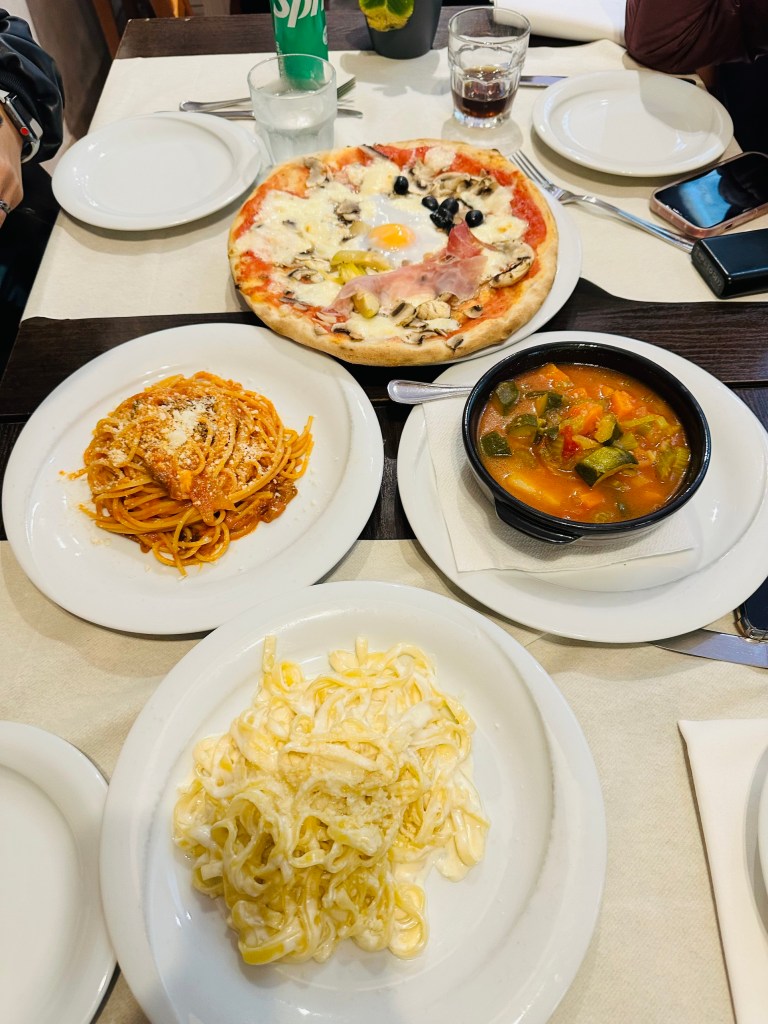 Bữa trưa với mỳ ý sốt kem, phô mai, thịt nguội, salami (trong tiếng Ý thì gọi là salame), bánh mỳ que và cơm rang. Tôi đương nhiên là không thể ăn được món mỳ rồi, nhưng vẫn ăn 1 miếng để không phụ tấm lòng của bà chị, sau đó thì xin phép từ chối vì không thể ăn được. Phô mai thì tôi lại càng không thể ăn được, ngửi mùi đã thấy sợ, vậy nên tôi chỉ ăn các món khác, đặc biệt là cơm rang, thèm cơm kinh khủng. Vừa ăn vừa uống rượu vang, thực sự là rất đưa mồm, vậy nên tôi uống liền 3 ly rượu, nếu không vì quá buồn ngủ thì chắc tôi còn uống nữa. Suốt những ngày đi chơi, ngày nào tôi cũng thấy buồn ngủ díp mắt suốt lúc đi, nhưng khi về nhà lại tỉnh như sáo, chả buồn ngủ tí nào. Ăn xong rồi, mọi người vẫn ngồi trò chuyện thì tôi không thể cưỡng lại cơn buồn ngủ nên ra sofa nằm, Sebi hỏi tôi có cần kéo sofa ra không, tôi bảo chỉ nằm chút thôi nên không cần, thế nhưng sau đó Fulvio vẫn ra kéo sofa rộng ra để tôi nằm thoải mái hơn.