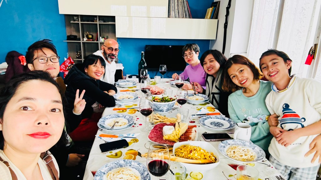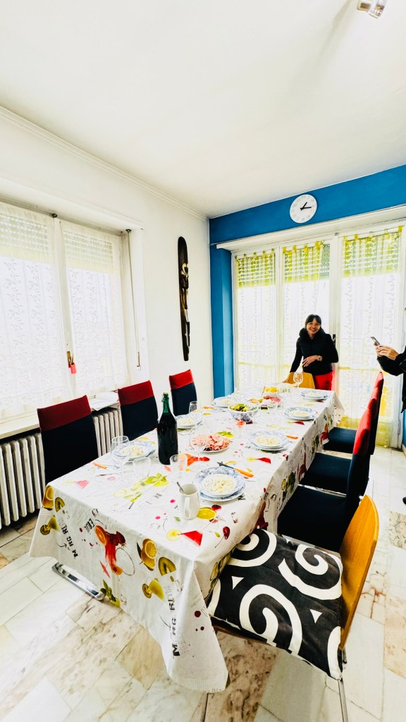 Bước vào trong nhà, cảm nhận đầu tiên của tôi là thật ấm áp, nhưng mục tiêu của tôi là cái nhà vệ sinh, chứ thêm lúc nữa chắc tôi vỡ đê mất. Fulvio ở trong phòng làm việc, chúng tôi vào phòng khách, chị Vui đã xếp sẵn bàn ăn, chỉ chờ chúng tôi đến để dọn món lên. Tôi quá mệt vì phải đi xe lâu nên nằm trên sofa nói chuyện với Sebi, Diệp thì vào bếp giúp chị Vui, mọi người loanh quanh ngắm nghía căn nhà. Rồi lần lượt mọi người cùng nhau giúp chị đưa món ăn ra và để lên bàn, Fulvio đi lấy rượu vang. Đây là loại rượu mà nhà chị vẫn hay uống, chị hay kể với tôi về trang trại rượu của ông bác mà chị hay lấy, chị còn gửi về VN cho những ai muốn mua, nếu không vì cái kho chứa rượu của bố tôi đã quá nhiều thì năm nào tôi cũng bảo chị lấy cho vài chai rồi.