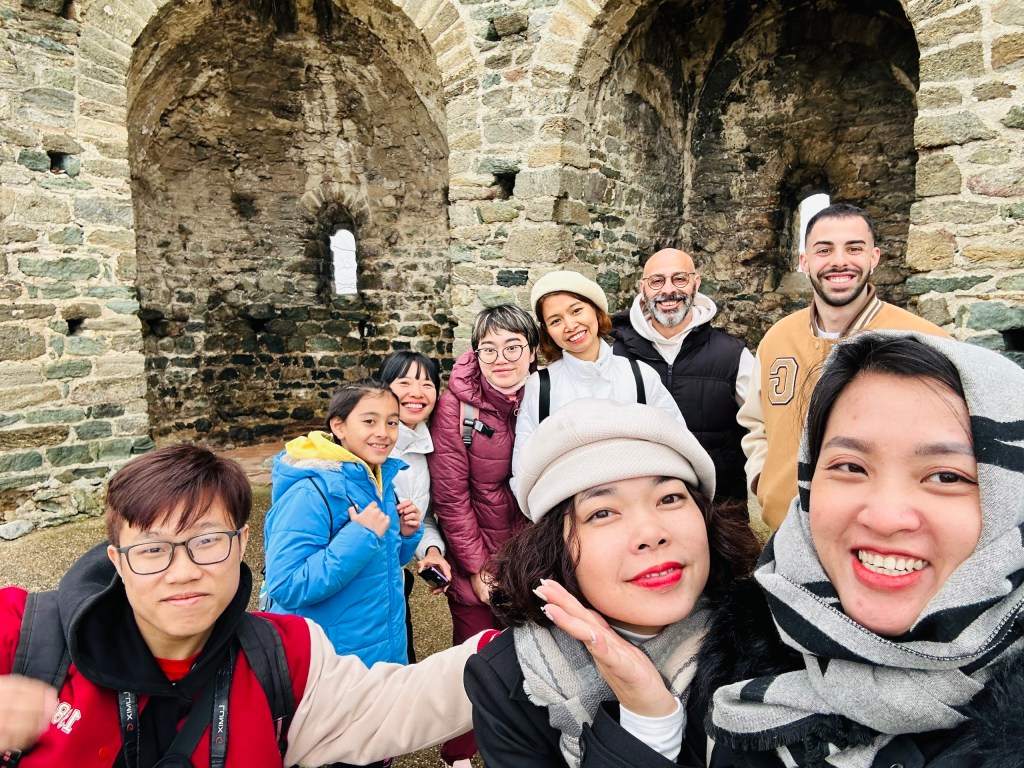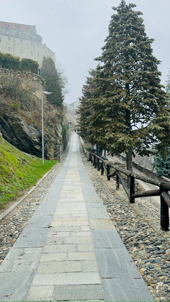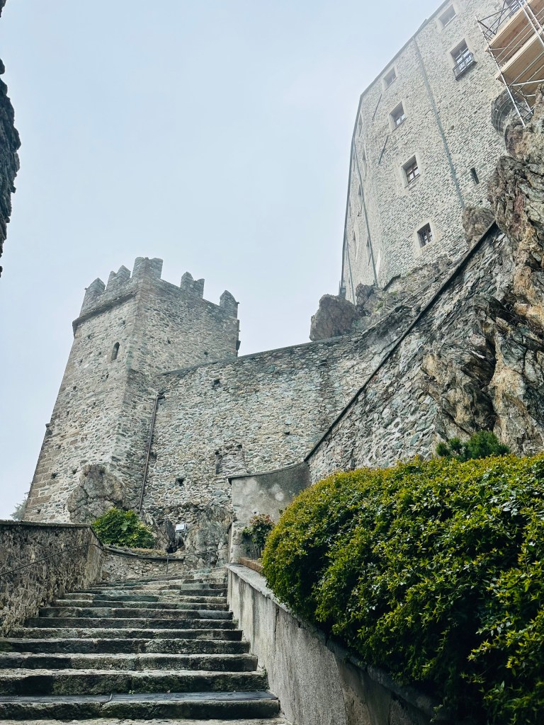 Điểm đến ngày hôm nay là Sacra di San Michele, hay còn được gọi là Tu viện Thánh Michael, là một khu phức hợp tôn giáo trên Núi Pirchiriano, nằm ở phía nam của Val di Susa trên lãnh thổ của đô thị Sant’Ambrogio di Torino. Trên đường đi, chị Vui có chỉ cho chúng tôi thấy đỉnh núi phía xa, nếu không mưa thì chị có thể đưa chúng tôi đến đó, nhưng do mưa thì sẽ rất nguy hiểm, có thể gặp tuyết lở. Thời gian di chuyển mất khoảng 40p, trời mưa nhỏ và nhiều sương mù, cũng vì thế mà có lẽ hôm nay vắng hơn mọi khi, chúng tôi đỗ xe được ở gần, chứ chị Vui bảo rằng mọi khi có mà phải đỗ ở tít phía dưới xa rồi đi bộ lên.