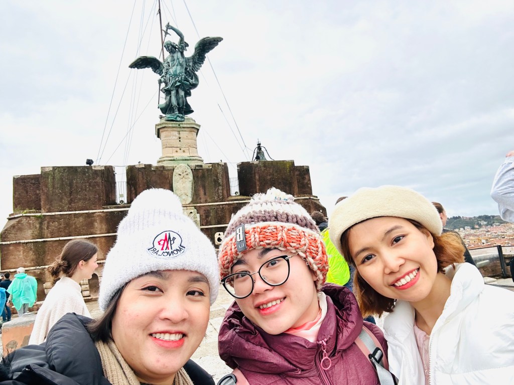Khi chúng tôi đi đến cửa ra, rất đông người đang đứng ở đó, ngoài trời mưa rất rất to, gió cũng mạnh. Chúng tôi đứng chờ 1 lúc, thấy có vẻ đã đỡ mưa hơn rồi thì mới đi ra. Đứng ở bến bus chờ xe, lần đầu tiên trong đời chúng tôi được trải nghiệm đứng dưới trời mưa to gió lớn, gió thổi tốc cả ô, ấy vậy mà sau lưng chúng tôi vẫn là những hàng dài người kiên nhẫn xếp hàng chờ mua vé vào Vatican, khâm phục thật. Sợ bus bỏ bến như ngày hôm qua, chúng tôi đã tính trước phương án, theo như google map báo còn 6p nữa xe đến, nếu đến khi đó mà không có xe, chúng tôi sẽ đi bộ đến Castel Sant’Angelo. Ơn giời, bus không bỏ chúng tôi, nên chúng tôi có thể đến kịp giờ. Ban đầu, Castel Sant’Angelo được Hoàng đế La Mã Hadrianus xây làm lăng mộ cho chính mình và hoàng gia, về sau, nó được các vị giáo hoàng sử dụng làm lâu đài và pháo đài. Nó nằm ngay bên dòng sông Tiber, từ trên đỉnh, chúng tôi có thể phóng tầm mắt nhìn được toàn cảnh Rome, thật may là khi lên đỉnh thì trời đã tạnh mưa, nhưng mà cả lũ cũng đã ướt kha khá rồi còn đâu.