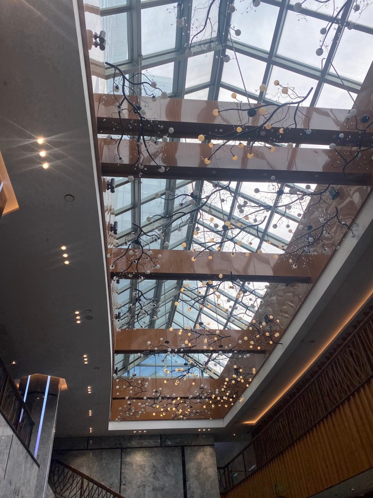 Hơn 2h chiều, trời càng lúc càng nắng và nóng, chúng tôi nhanh chóng lên xe để đi đến đồi Zaisan. Mọi người vào ăn tại 1 nhà hàng ở dưới chân đồi, bữa trưa muộn của chúng tôi là món Hàn, khá cay, nhưng đói nên ai ăn cũng ngon miệng. Ăn xong, chúng tôi đi lên đồi, đây là nơi tôn vinh các anh hùng Mông Cổ và Liên Xô trong thế chiến thứ II, cũng là nơi có thể nhìn ngắm toàn cảnh Ulaanbaator. Theo hướng dẫn của Batmunkh, chúng tôi đi vào 1 tòa nhà, đập vào mắt tôi là 1 cửa hàng bán kẹo socola và 1 hàng trà sữa trông rất đẹp, nhìn lên trần nhà tôi thấy nó được trang trí bằng những cái đèn trông như những cành cây, nếu vào buổi tối hẳn sẽ rất đẹp. Tòa nhà khá lớn, chúng tôi tìm mãi mới thấy thang máy, nhưng thang máy sẽ chỉ cho đi lên đến tầng 15, còn lại chúng tôi sẽ phải đi bộ theo những bậc thang lên đồi, đoạn đi bộ dài tầm 2km, lại dốc thoải thoải nên khá dễ đi. Từ chỗ thang máy đi ra đến cầu thang, chúng tôi phải đi qua 1 hành lang bằng kính, nhìn xuống sàn nhà bằng kính, có thể thấy ngay chữ Zaisan rất to ở bên cạnh là tượng con khủng long bạo chúa đang há mồm. Tôi hơi sợ khi đi qua hành lang này, có cảm giác lỡ kính nứt vỡ thì rơi xuống là toi, nhưng vẫn cố bon chen ngồi chụp cái ảnh check in. Bước ra khỏi hành lang, tôi thấy 1 cầu thang dài dẫn lên đồi, trời nắng chói chang nên việc leo lên đồi cũng khiến con người ta cảm thấy mệt dù quãng đường không quá dài. Có khá nhiều du khách nước ngoài cũng đi lên, cứ 10 bậc là lại có 1 hàng ghế đá cho mọi người ngồi nghỉ, càng đi lên cao càng gió lớn, nhưng không khí rất trong lành.