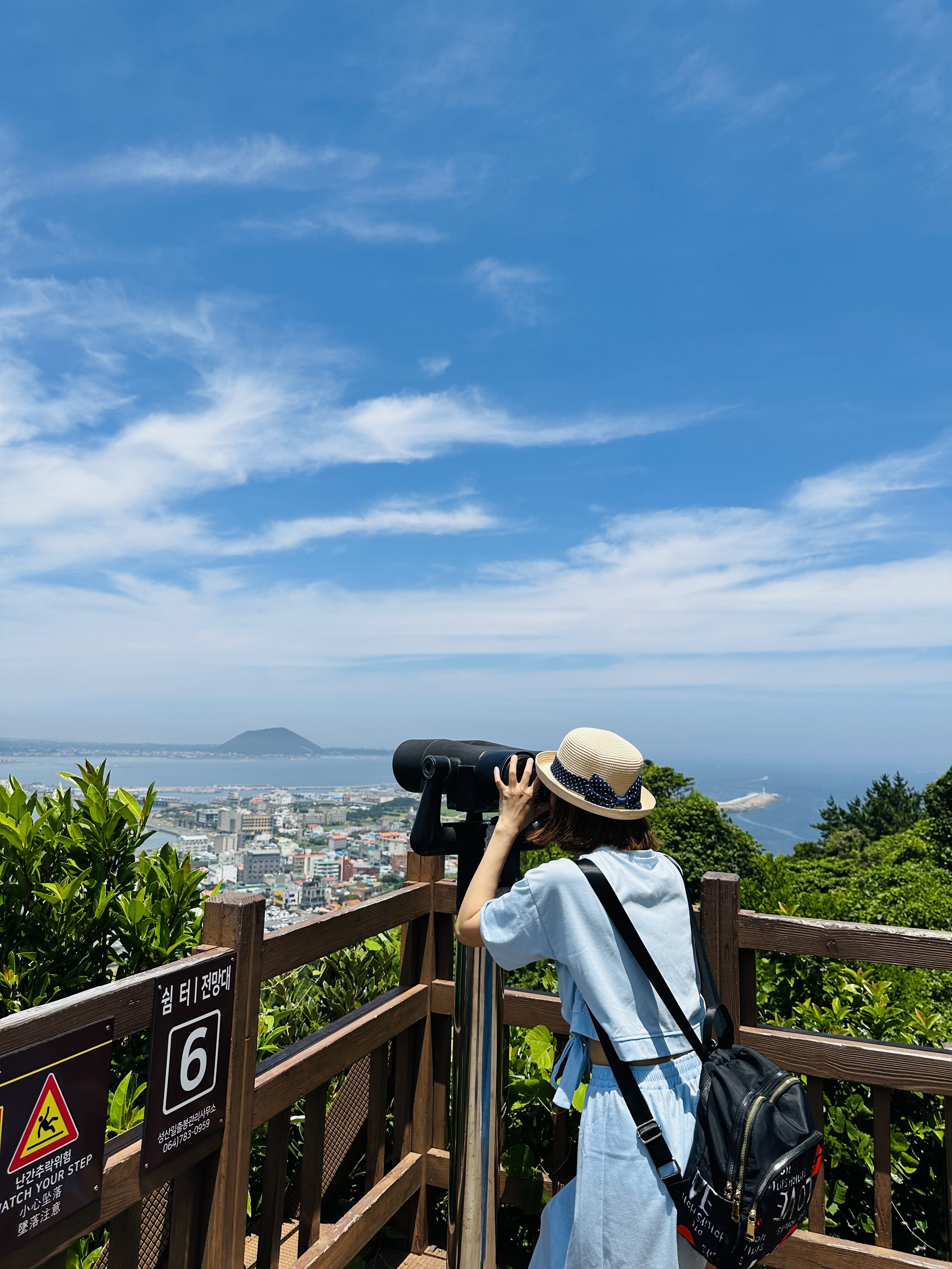 Kế tiếp, chúng tôi đến đỉnh núi Seongsan Ilchulbong. Bãi đỗ xe rất lớn, nhưng tôi đi 1 vòng thấy những ô đỗ xe toàn ghi bus, do đó tôi ko dám đỗ. Nhìn đi nhìn lại, tôi phát hiện ra là chả ai quan tâm đến quy định của bãi đỗ xe cả, xe con, xe to gì cũng đỗ hết vào những ô dành cho bus cả, thôi thì thiên hạ đỗ được thì mình cũng đỗ vậy, tôi chọn 1 ô và phi vào. Trời nắng to, nhưng cái nắng của Hàn ko rát như cái nắng của Hà Nội, và lần nào đi du lịch thì tôi cũng thích phơi ra dưới nắng, dù sao tôi cũng đen sẵn rồi mà. Hành trình leo lên đến đỉnh núi cũng khá vất vả, quãng đường 2km nếu đi đường bằng thì tôi đi vô tư, nhưng leo núi thì tôi ko quen. 2 chị em tôi lại chủ quan, vứt hết chai nước ở trong xe, thế là đến 1 trạm nghỉ chúng tôi mua 1 chai nước. Lên đến đỉnh là bạn có thể nhìn toàn cảnh thành phố Seogwipo, thành phố lớn nhất ở đảo Jeju. Ở trên đỉnh gió khá mát, nhưng nắng rất chói chang, ngồi nghỉ 1 lúc thì chúng tôi đi xuống. Đương nhiên là đi xuống thì dễ dàng hơn đi lên rồi, ở chân núi có 1 con đường bao biển khá đẹp, mọi người đi ra đó chụp ảnh khá nhiều, nhưng tôi cảm thấy quá mỏi chân và mệt nên ko ra, chỉ có em gái tôi đi ra chụp cảnh.