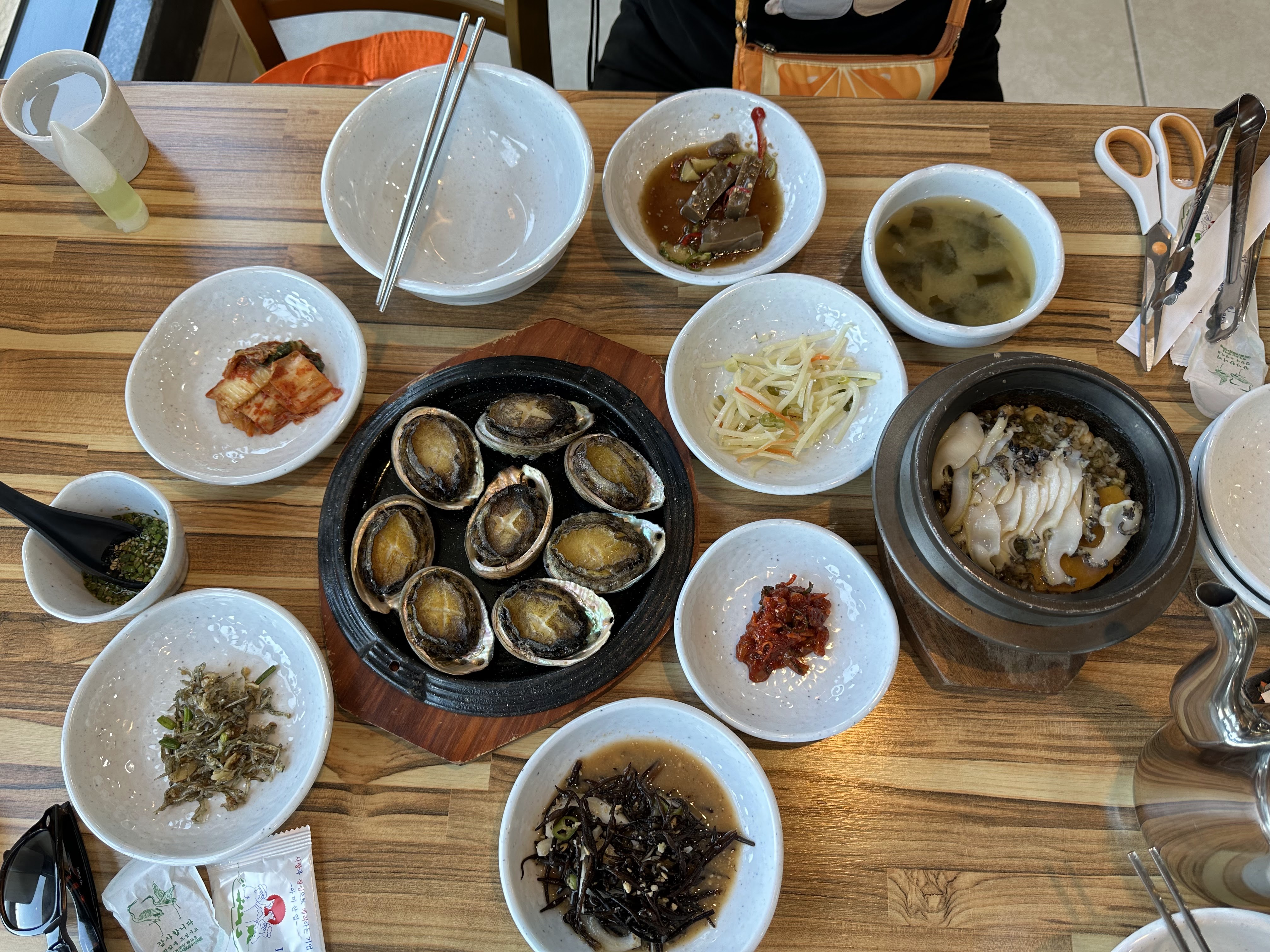 1 điều mà tôi khá thích ở Jeju là hầu hết các bãi đỗ xe đều miễn phí, nếu ở Việt Nam thì chắc tôi mất kha khá tiền cho việc đỗ xe rồi. Ra đến xe đã là hơn 12h, bụng chúng tôi réo liên hồi. Tra trên GPS các nhà hàng mà tôi đã ghi vào lịch trình thì có nhà hàng bào ngư là gần nhất, lái xe mất khoảng 15p. GPS đưa tôi đi vòng quanh bãi đỗ xe 2 lần thì mới thấy đường ra, chúng tôi theo định vị đi men theo con đường bao biển, bảng chỉ dẫn trên đường ghi tốc độ tối đa là 50km/h, tôi rất tuân thủ đi đúng, nhưng các xe phía sau tôi thì ko nghĩ vậy. Họ phát chán với việc đi sau 1 con rùa, thế nên chỉ 1 lát là tất cả đều vượt lên hết, cho tôi hít khói. Rẽ vào quán bào ngư, tôi hơi lo lắng do đường hơi dốc, xe đỗ 2 bên đường khá đông, tôi đã định chen chân vào 1 chỗ trống nhưng rồi lại phi lên đến tận cửa quán, ngay đó là chỗ đỗ xe khá trống, tôi có thể thoải mái mà đỗ vào. Do menu quán toàn tiếng Hàn, 1 lần nữa tôi phải dùng đến phần mềm dịch để gọi món. Đặc trưng của Hàn là bạn đi bao nhiêu người thì phải gọi bấy nhiêu suất ăn, ko cần biết bạn ăn nhiều hay ít. Kim chi của quán khá ngon, em gái tôi muốn xin thêm mà đang chưa biết nói như thế nào để người ta hiểu ý mình thì 1 chị phục vụ đến. Chị hỏi chúng tôi bằng tiếng việt, tôi rất mừng vì có thể nghe thấy tiếng việt ở nơi này, chị hướng dẫn chúng tôi ra quầy tự lấy thêm các loại panchan nếu thích, chị cũng rất ngạc nhiên khi thấy chúng tôi tự đi ra đây du lịch, bởi hầu như khách đến quán này đều đi theo đoàn. Bào ngư khá ngon, quả thật ko phí phạm khi đến đây, mà trang Tripadvisor cũng chấm điểm cho quán này khá cao, nhưng món bào ngư nướng đều có phô mai, mà chị em chúng tôi đều ko ăn được phô mai. Sau khi phát hiện ra nếu ăn kèm với kim chi thì sẽ át được mùi phô mai thì vèo cái chúng tôi xử lý xong món bào ngư nướng, cơm bào ngư ăn cũng rất ok, hơi nhạt nhưng ăn kèm kim chi thì ổn. Kết thúc bữa trưa, chúng tôi lên đường cho hành trình tiếp theo, mà không nghĩ là buổi chiều sẽ đổi lịch trình, ko như dự định. (To be continued)