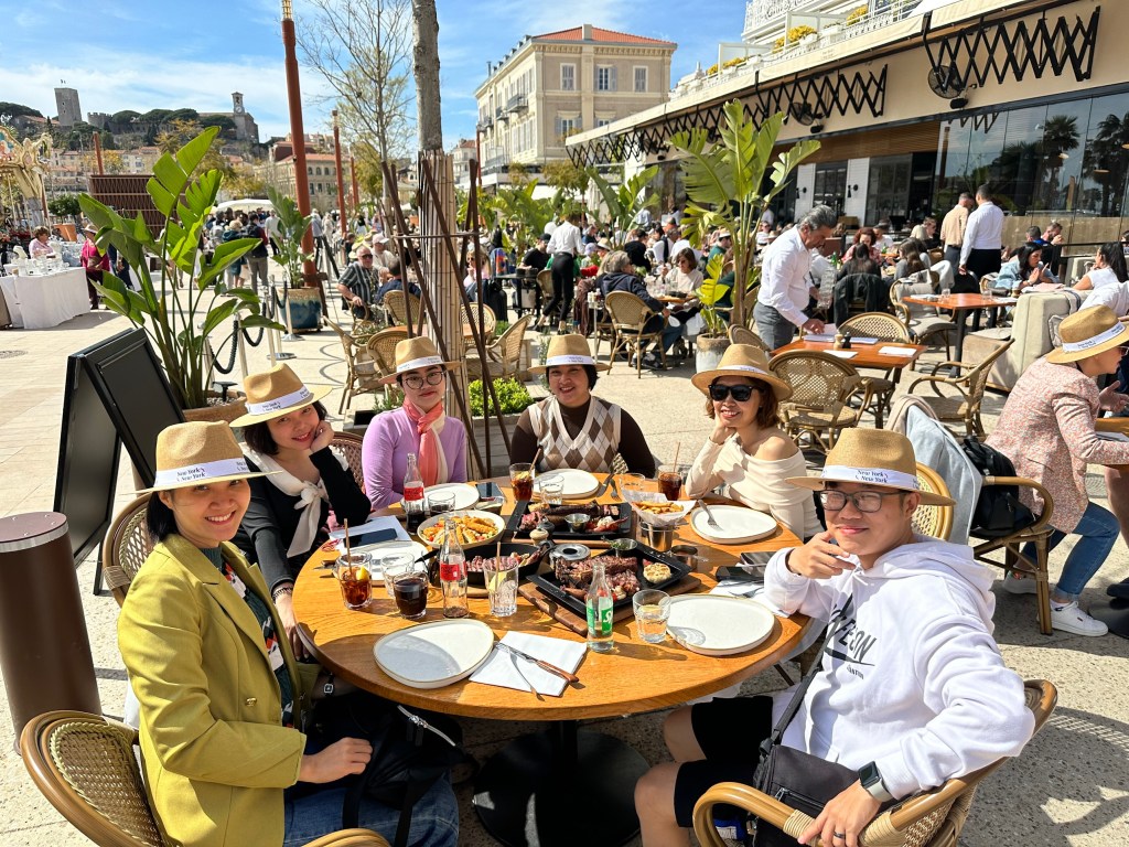 Rời khỏi Cung Đại hội, chúng tôi đi tiếp, có 1 quảng trường với 1 đài phun nước, xung quanh là rất nhiều quán ăn và café, trời nắng ấm, tôi rất thích cái nắng này, thích phơi mình dưới nắng, mỗi tội cởi áo khoác ra thì vẫn lạnh nên lại mặc áo khoác vào. Nhìn đồng hồ cũng gần 12h rồi, chúng tôi quyết định lấp đầy cái dạ dày đã rồi mới đi tiếp. Ngay cạnh chỗ chúng tôi đứng có 1 nhà hàng vẫn còn bàn trống, chúng tôi vào, đợi bạn nhân viên xếp bàn cho, ngồi ăn ngoài trời dưới ánh nắng ấm áp, trải nghiệm thực sự khó quên ở miền nam nước Pháp, ai cũng nên thử. Nhà hàng mà chúng tôi ngồi có tên là New York, nhà hàng có mũ cho khách đội nếu không muốn bị nắng, và thế là chúng tôi có đồng phục mũ, rất thú vị. Sau khi xem menu, bọn tôi quyết định chọn 1 set 196E và thêm 1 món gà nữa, nhìn menu ghi là set này cho 2-3 người, nhưng với kinh nghiệm đã ăn ở Café de Turin thì 6 người chúng tôi ăn 1 set là ok, huống chi nó còn ghi rõ là có tận 2.2kg thịt ở trong set này. Khi đồ ăn được mang ra, chúng tôi thực sự được tận hưởng đúng chuẩn beefsteak Pháp, thịt mềm, chín vừa, không dai, bữa ăn này tính ra đắt nhất nhưng nó cực kỳ đáng với số tiền bỏ ra, mà hương vị của nó thì nhớ mãi không quên. Hơi tiếc chút là Phương không ăn được đồ sống, vậy nên bọn tôi cố gắng tìm phần nào chín nhất để phần cho Phương, hôm trước đi ăn hải sản cũng vậy, món hàu sống ăn ngon tuyệt mà em ý không ăn được, quá đáng tiếc luôn.