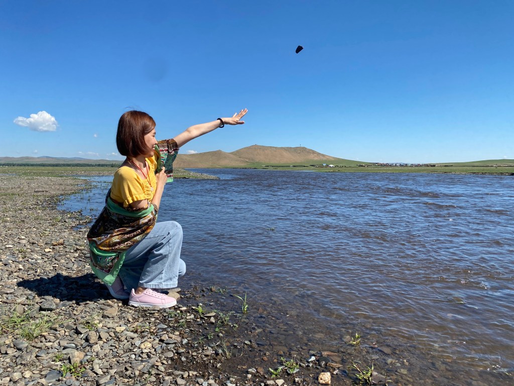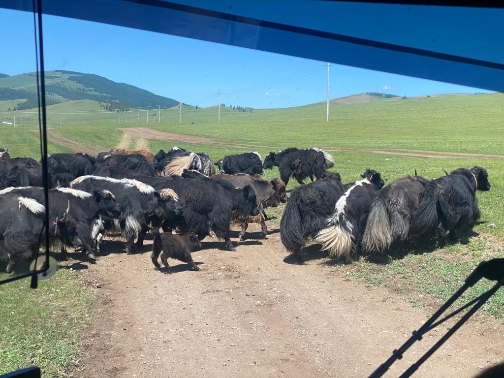 Trên đường rời Kharkhorin, chúng tôi lại đi qua bảo tàng, lần này thế cờ đã đổi, có lẽ mỗi hôm nó sẽ được sắp xếp 1 thế cờ khác nhau. Đi qua sông Orkhon, chúng tôi mới có thể thấy cuộc sống bên bờ sông của người dân nơi đây, người lớn giặt giũ bên sông, trẻ con chạy đuổi nhau, những người đàn ông thì xếp cỏ, lùa dê, cừu… Ở đây cũng có những nhà máy công nghiệp lớn, vẫn nhả ra những cột khói trắng và không hề có mùi gì trong không khí, bạn vẫn có thể cảm nhận được không khí trong lành của thảo nguyên. Chúng tôi đi hơn 1 tiếng thì bắt đầu rời khỏi cao tốc, rẽ vào 1 con đường đất, chỉ có vệt bánh xe đi qua tạo thành đường, còn lại tất cả đều hoang sơ. Có 1 cây cầu bắc qua suối, nhìn từ trên xe thì cầu khá nhỏ, không biết có thể đi qua được không vì xe chúng tôi là xe 29 chỗ, ấy vậy mà sau 1 lúc chỉnh lái thì bạn lái xe cũng đưa được xe qua rất nhẹ nhàng, sau đó bạn ý liền dừng xe lại cho mọi người có thể chơi 1 lúc ở bên suối, cũng như có thể chụp ảnh đàn bò Yak đang gặm cỏ gần đó. Tôi chỉ dám đứng nhìn từ xa, những con bò Yak thực sự rất to, và cũng rất hôi, tôi chỉ sợ nếu lại gần thì có thể làm chúng nổi điên. Ngắm chán chê thì tôi ra bên suối nghịch nước 1 chút, trời nắng chói chang mà vẫn cảm thấy hơi lành lạnh, không quấn khăn thì lạnh, mà quấn khăn vào lại cảm thấy hơi nóng. Chơi 1 lúc thì chúng tôi lại lên xe đi, quả thật nhìn con đường trước mặt mà tôi chỉ muốn đi về, chỉ toàn sỏi đá, xóc kinh khủng, ngồi trên xe cứ dập dềnh lên lên xuống xuống. Đi khoảng 1 tiếng chúng tôi lại gặp 1 đàn bò Yak đi ngang qua trước xe, rồi 1 đàn cừu lớn nữa, mọi người lại hớn hở xuống xe để quay chụp. Tôi nhìn phong cảnh xung quanh thấy thật hùng vĩ, bao quanh là những dãy núi cao, thảo nguyên xanh mướt, ngẩng đầu lên có thể thấy chim đại bàng bay trên đầu, rồi những con sóc chạy rất nhanh vụt qua, tất cả đều hoàn toàn tự nhiên, không hề có sự can thiệp của bàn tay con người ở nơi này, rất tuyệt vời.